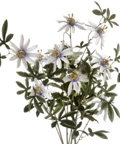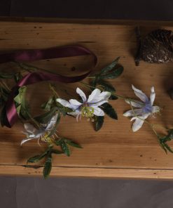 A single stem passionflower spray comprising 3 passionflower heads and dark green leaves.